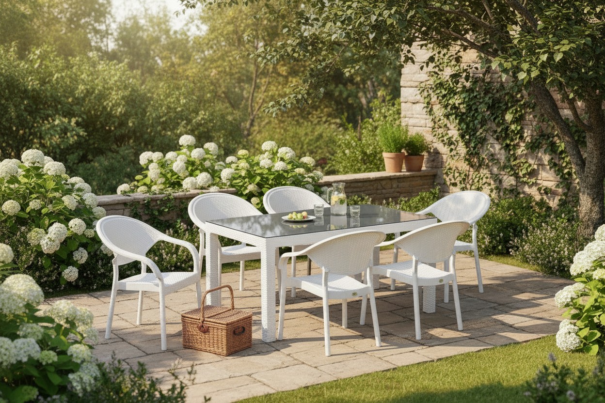90 x 150 Bambu Plastik Rattan Camlı Bahçe Balkon Teras Masa Takımı 6 Kolçaklı Sandalyeli Beyaz