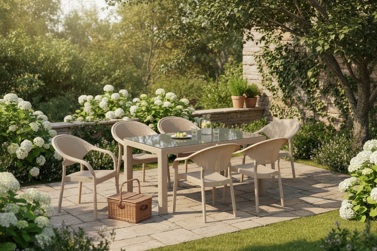 90 x 150 Bambu Plastik Rattan Camlı Bahçe Balkon Teras Masa Takımı 6 Kolçaklı Sandalyeli Bej