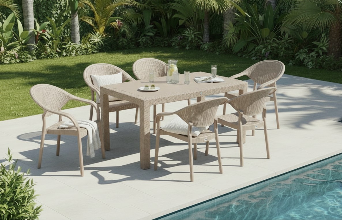 90 x 150 Bambu Plastik Rattan Camsız Bahçe Balkon Teras Masa Takımı 6 Kolçaklı Sandalyeli