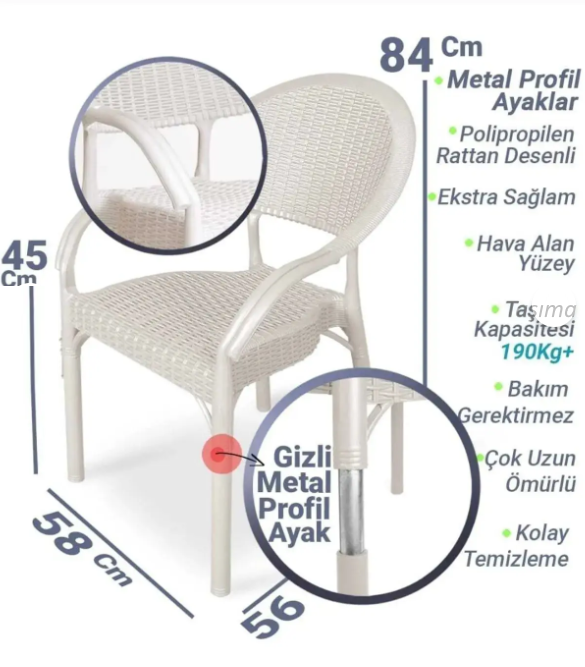 - Sandalyelerin ayaklarında metal profil bulunmaktadır.